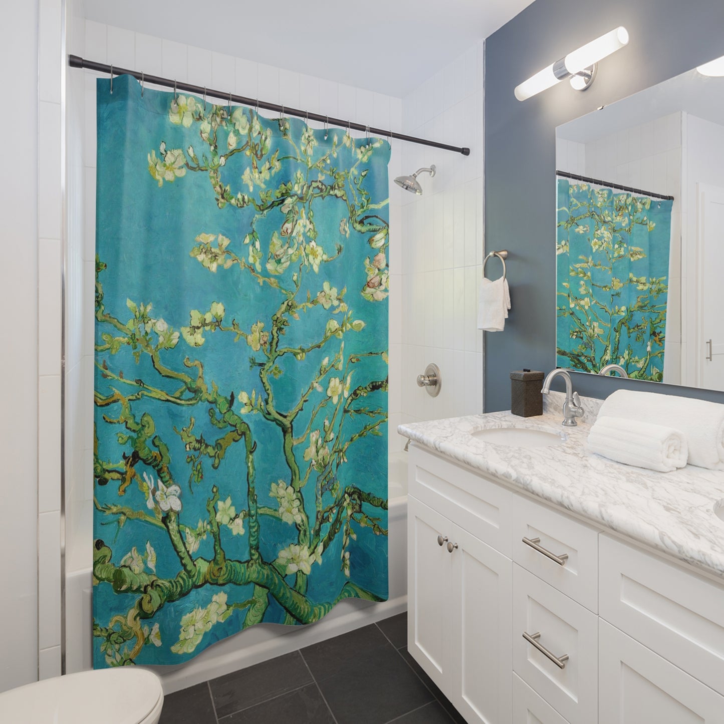 Enter the world of renowned artist Vincent Van Gogh with this exquisite Vincent Van Gogh shower curtain. Transform your bathroom into a gallery of artistry and creativity with the vibrant Almond Blossoms design that adorns this unique shower accessory.