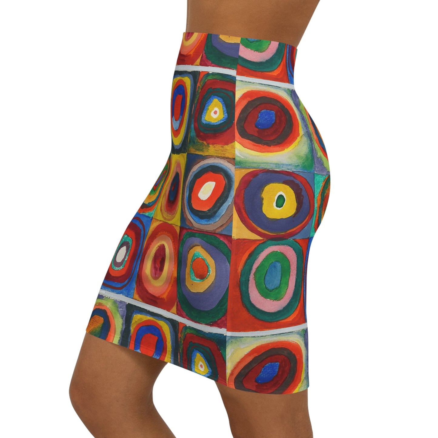 Designed for those who appreciate the beauty of abstract art, this custom pencil skirt boasts a vibrant print inspired by Kandinsky's iconic Farbstudie Quadrate masterpiece. It's ideal for those who believe that fashion is a form of self-expression, making a bold statement wherever you go.